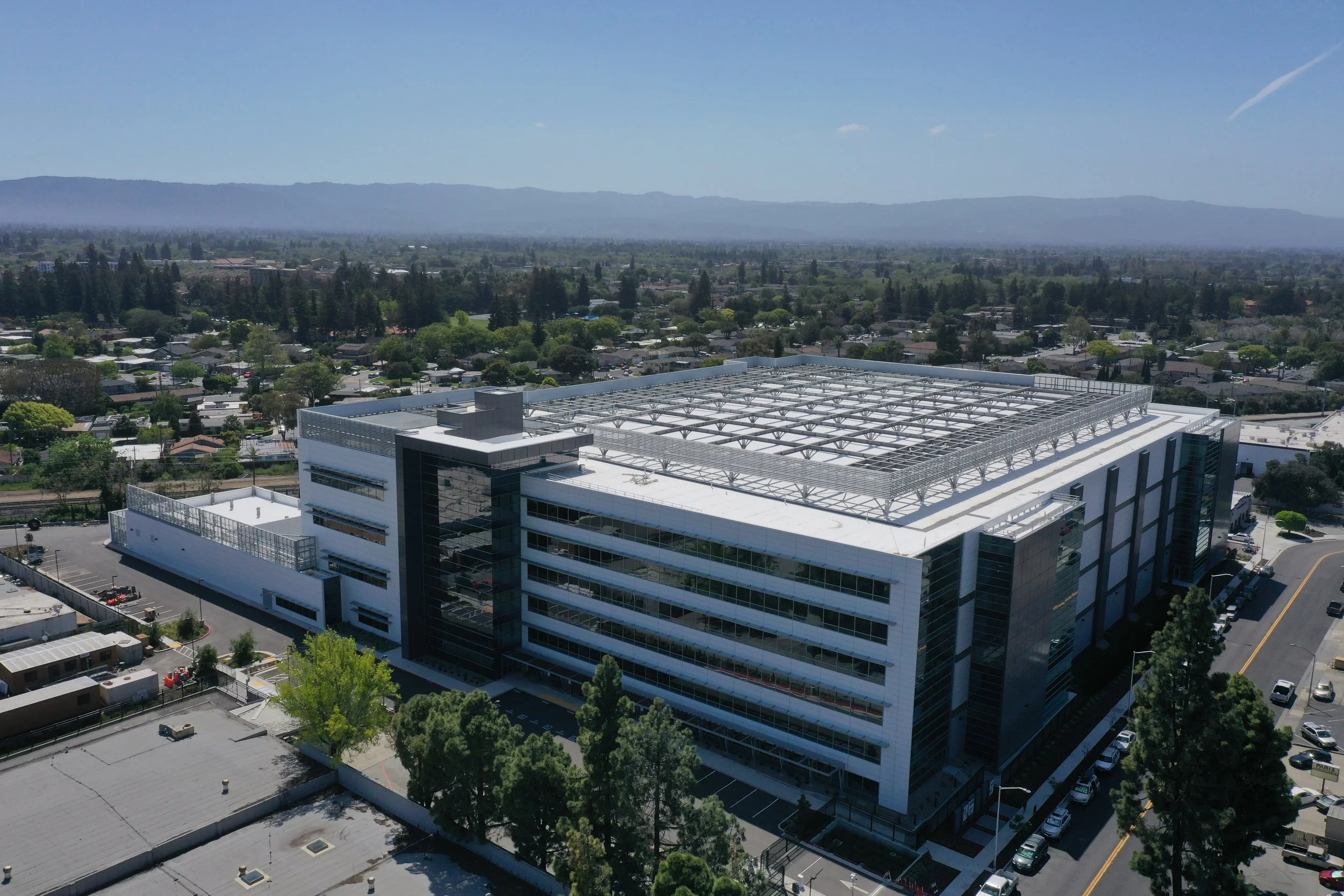 • Aerial view of a large building complex with glass windows and a flat roof, surrounded by a parking garage filled with cars, and adjacent to a green field.